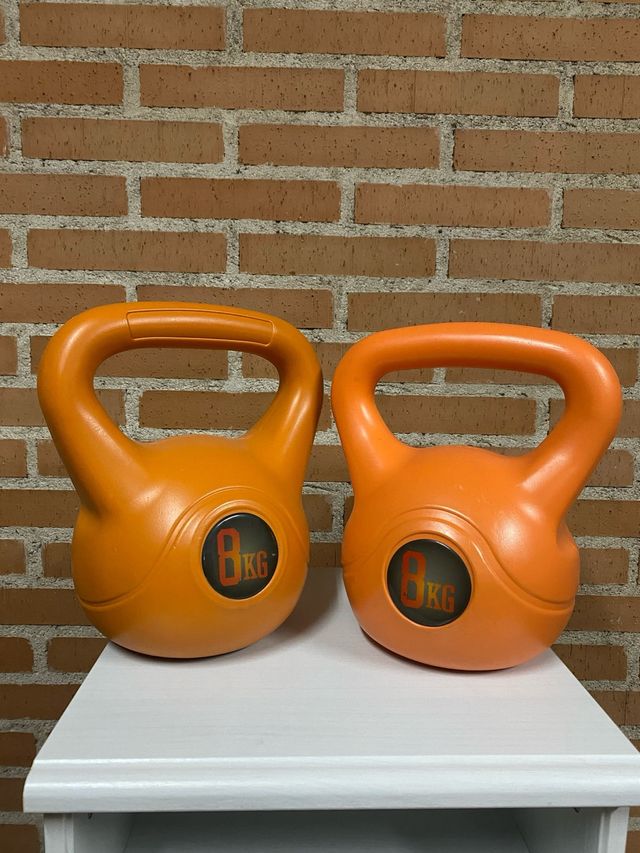 Par de mancuernas tipo kettlebell de color naranja. - Cada pesa tiene un peso de 8kg. - Diseño ergonómico para un agarre cómodo.