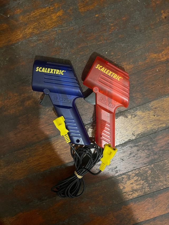 Dos mandos para circuitos Scalextric, uno en color azul y otro en rojo. - Mandos con cable. - Conectores amarillos.
