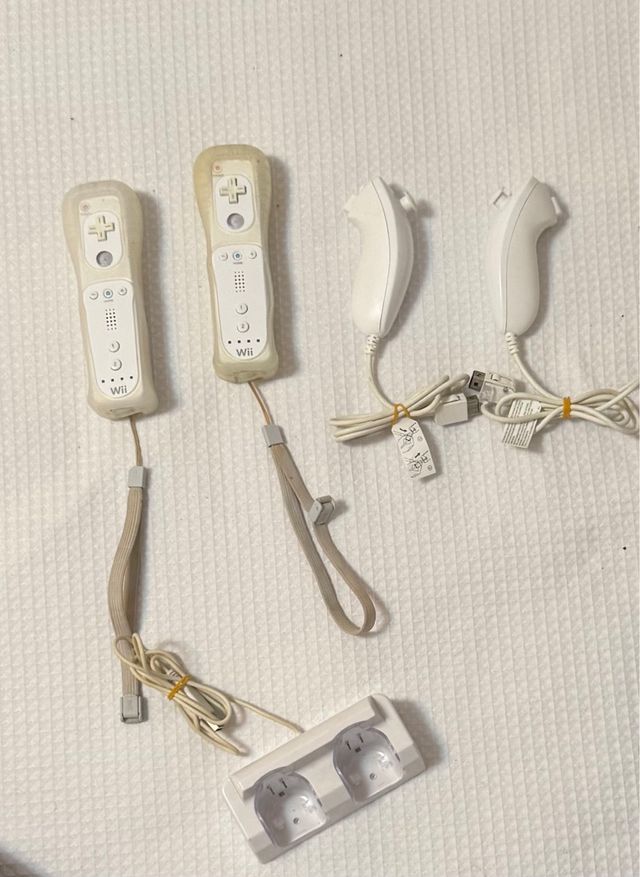 - Incluye dos mandos Wii remotos (PARA PIEZAS O REPARAR), dos nunchucks y una base de carga para dos mandos (DUDOSO funcionamiento debido a que no encienden los mandos)
