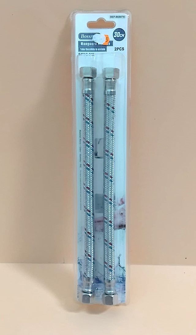 Detalles del productoPack de dos mangueras flexibles Bossram de 30 cm de acero.