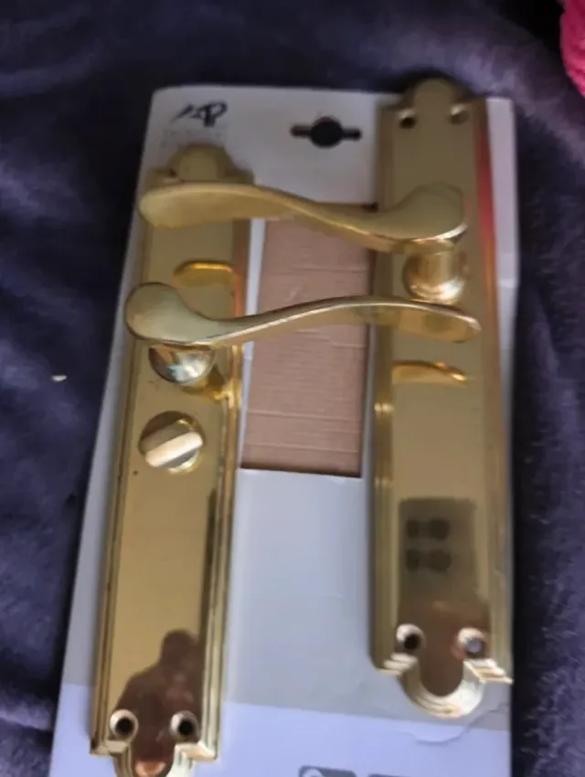 Detalles del productoJuego de dos manillas para puerta con acabado dorado y pestillo. Se encuentran en muy buen estado.