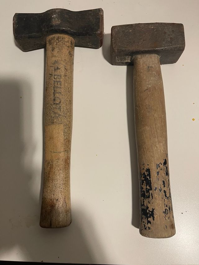 Se venden dos martillos con mangos de madera. - Un martillo tiene el mango con inscripciones y el otro con restos de pintura negra. - Ambos mangos son de madera.