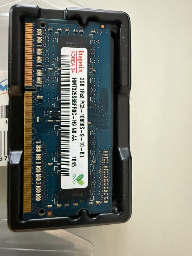Dos módulos de memoria RAM para portátil. - Capacidad total de 4GB (2GB cada uno). - Tipo: DDR3. - Velocidad: PC3-10600S. - Fabricante: Hynix.
