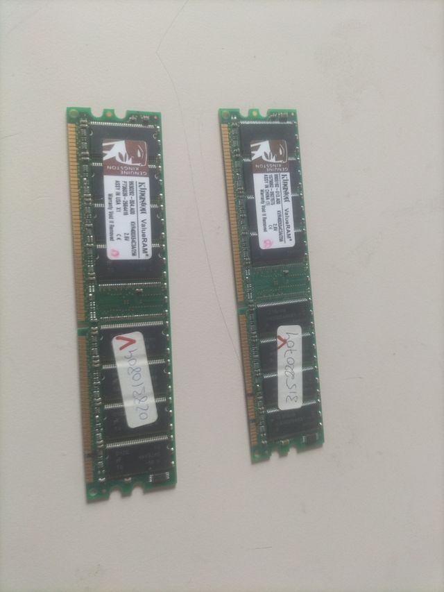 Dos módulos de memoria RAM Kingston ValueRAM. - Capacidad: 256MB cada una. - Tipo: DDR. - Voltaje: 2.6V.