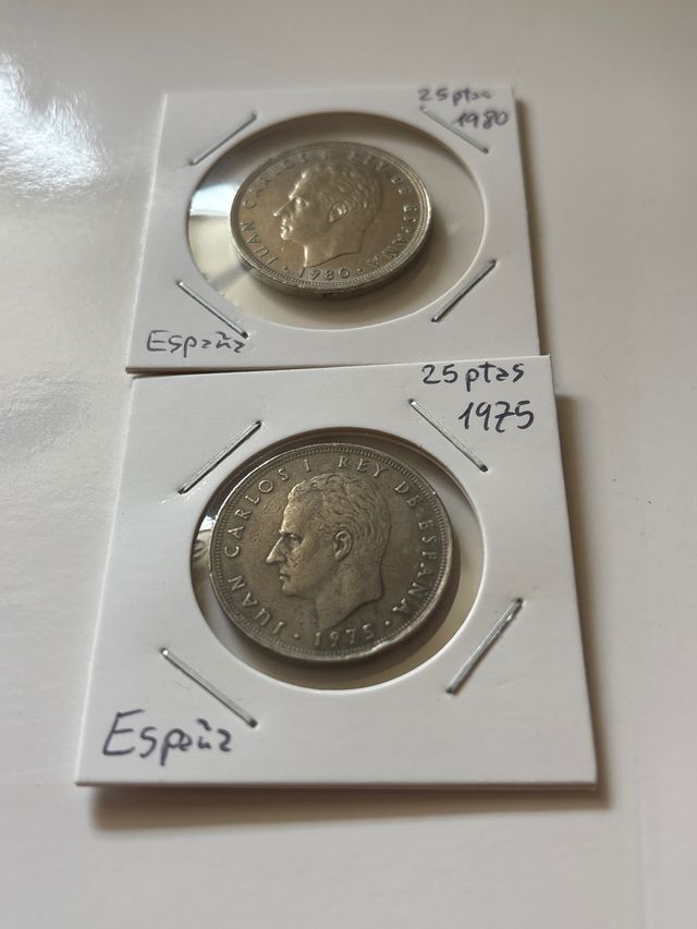 Dos monedas de 25 pesetas de Juan Carlos I. - Una moneda del año 1980. - Otra moneda del año 1975.