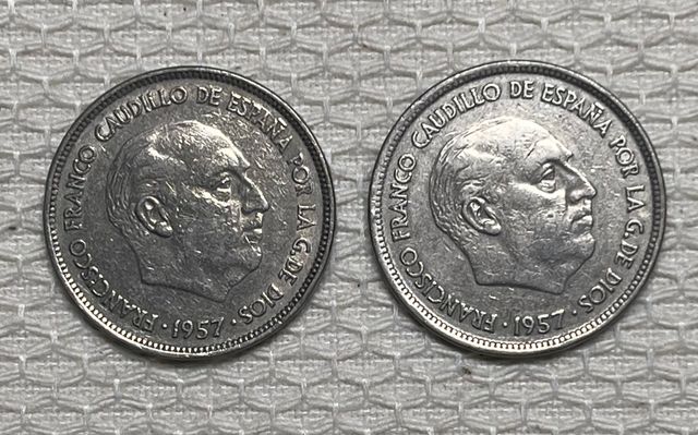 Detalles del productoConjunto de dos monedas españolas de 25 pesetas del año 1957.