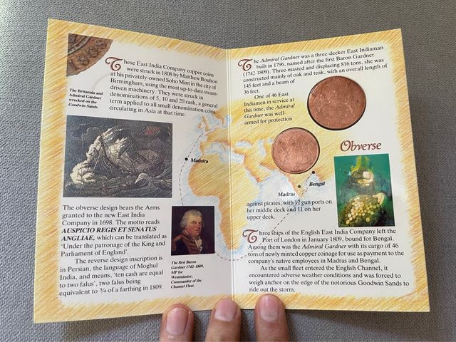 Detalles del productoSe venden dos monedas de cobre de la East India Company de X y XX cash acuñadas en 1808 y recuperadas del pecio Admiral Gardner. en buen estado, en tarjeta expositora y explicativa