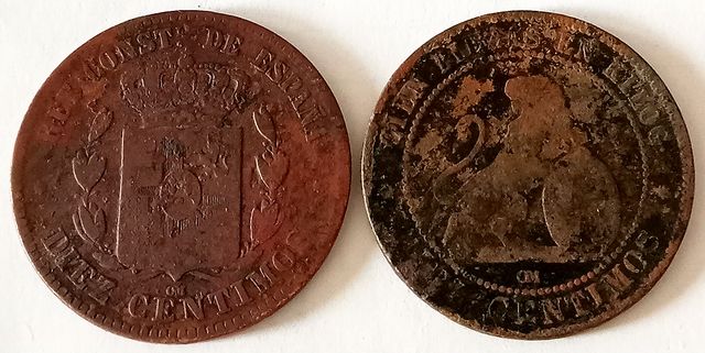 Detalles del producto2 monedas de 10 céntimos de pesetas antiguas. Una de 1870, primera república española y otra de1879 Alfonso XII. (30 mm de diámetro). Zaragoza ciudad (centro). GASTOS de ENVÍO otros destinos, por cuenta del comprador, por Correos ordinario cuesta 1,60 euros el envío de una a tres monedas. Se pueden hacer combinaciones o lotes con varias monedas para que cualquier tipo de envío salga más económico.