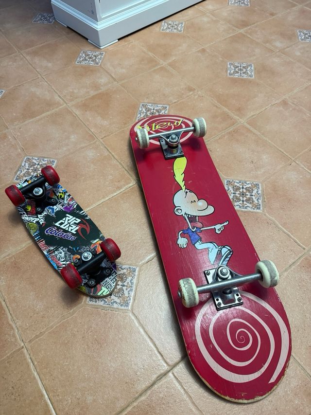 Detalles del productoSe venden dos skate patin . Uno es de tamaño grande y el otro es mini, ideal para regalar. Ambos presentan señales de uso, pero están en buen estado general.