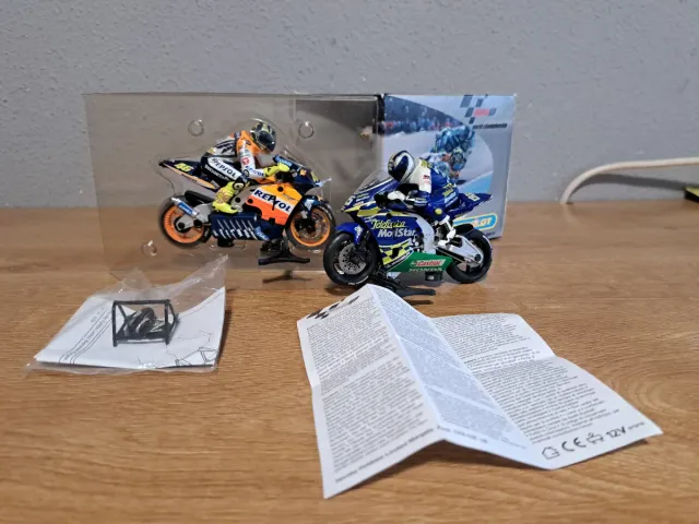 Dos motos de colección Scalextric Superslot. - Moto Repsol con dorsal 46. - Moto Telecinética MoStar. - Incluye soporte para ruedas y manuales.