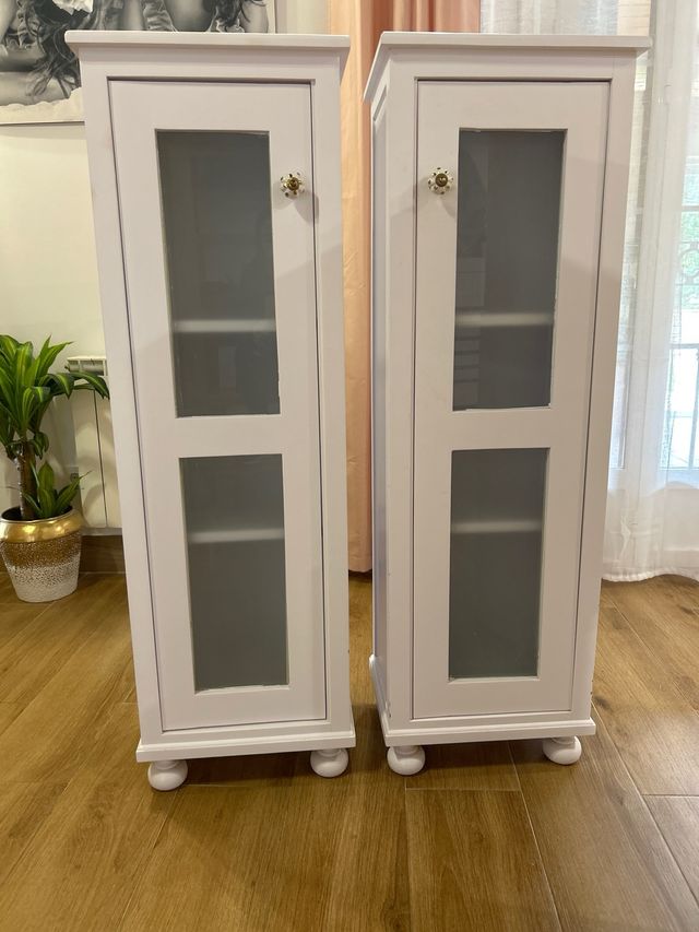 Detalles del productomuebles de ebanisteria de madera lacado en blanco muy bonitos y en muy buen estado, tiradores de porcelana y patas de madera maciza con dos baldas interiores ,puerta abatibles .160€ los dos Medidas del producto