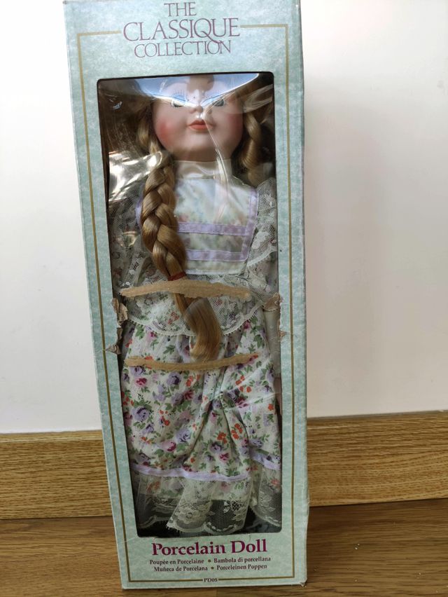 Detalles del productoMuñeca de porcelana de la colección The Classique Collection Porcelain Doll. Con la caja original incluida (con la parte del nombre rota tal y como se ve en las fotos). Medidas de la caja 41x14x9 cm aprox.