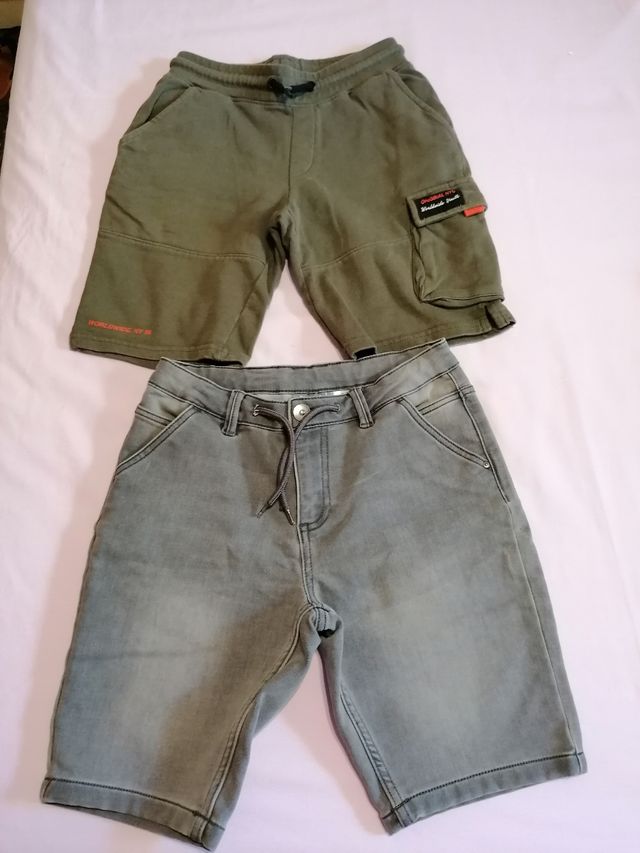 Lote de 2 pantalones cortos de niño. Talla 11-12 años. Unos jeans elásticos de color gris lavado, con cintura ajustable, y otros deportivos cargo verde militar de primark.