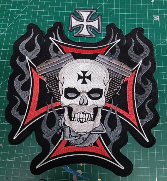 Detalles del productoSet de dos parches bordados para ropa motera. Uno grande con diseño de calavera, motor y cruz de hierro, y otro pequeño con cruz de hierro.