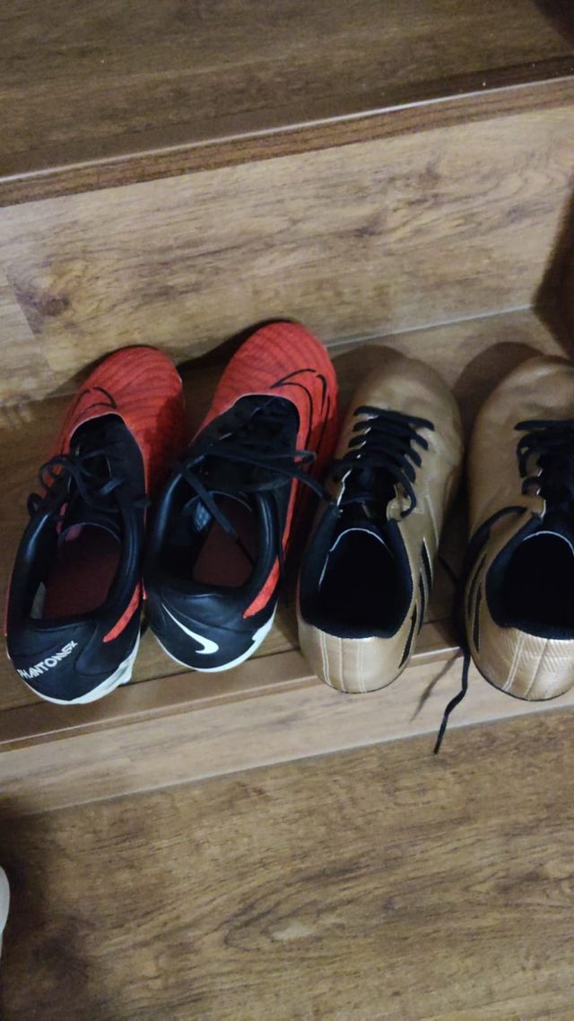Se venden dos pares de botas de fútbol para niño o niña, talla 38. - Un par de botas de color rojo y negro. - Un par de botas de color dorado.