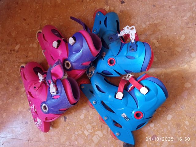 Detalles del productoPatines en línea de la marca Oxelo, con cuatro ruedas de goma de 63 mm., freno de goma y cierres de carraca.