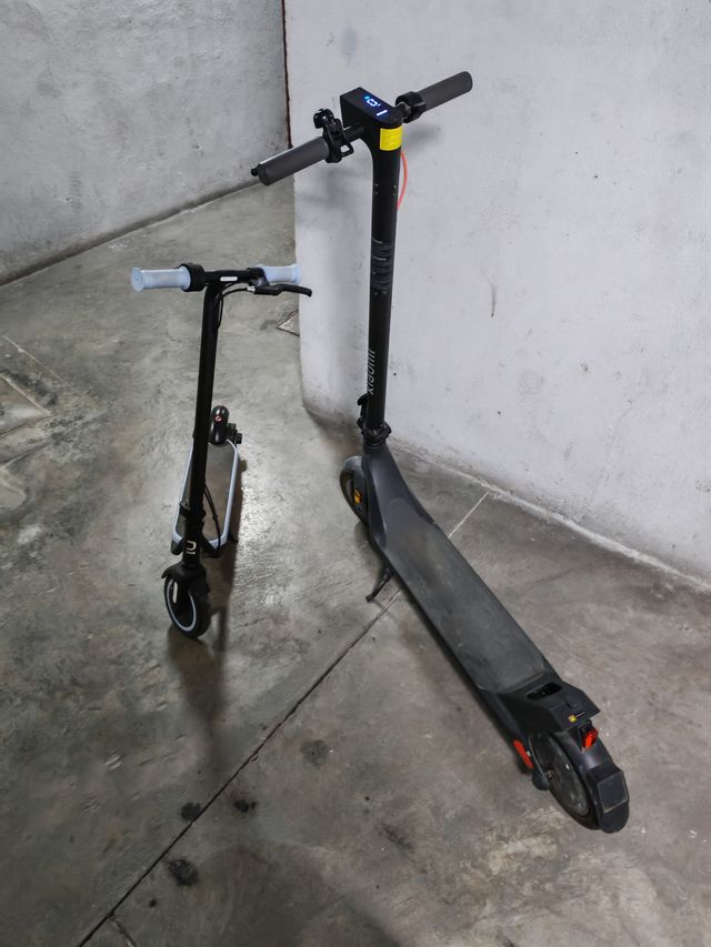 Se venden dos patinetes, uno diseñado para niños y otro para adultos. Ambos son de color negro. - Patinete infantil. - Patinete para adulto.