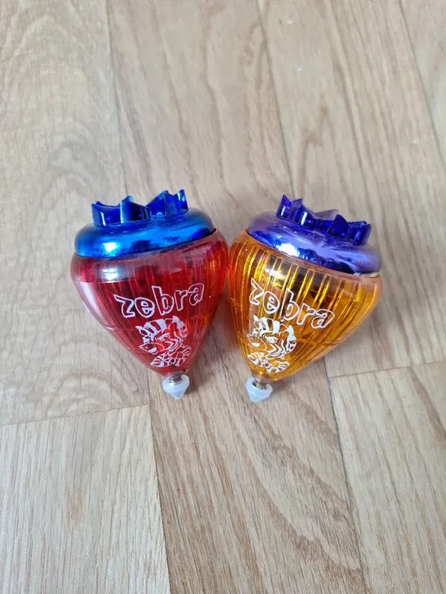-Lote de Dos Peonzas de plástico de la marca ZEBRA. Son de colores rojo y naranja. Dentro de cada peonza viene una cuerda para poder utilizarla.