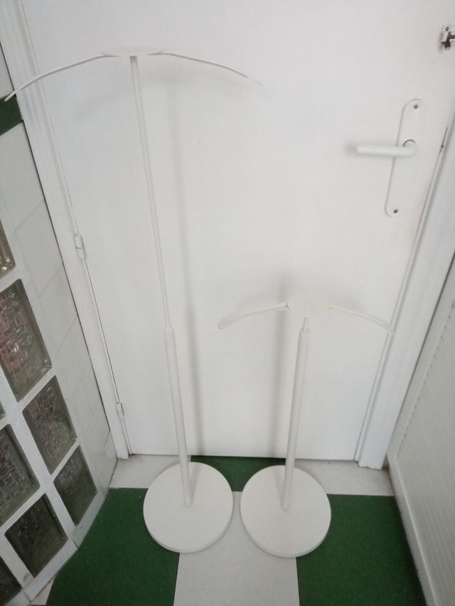 Detalles del productoSe venden dos percheros expositores de color blanco, extensibles, alcanza una altura aproximada de 1,15cm.Son ideales para tiendas de ropa u otros negocios. También se puede comprar individual. (Uno 7€, dos 10€).
