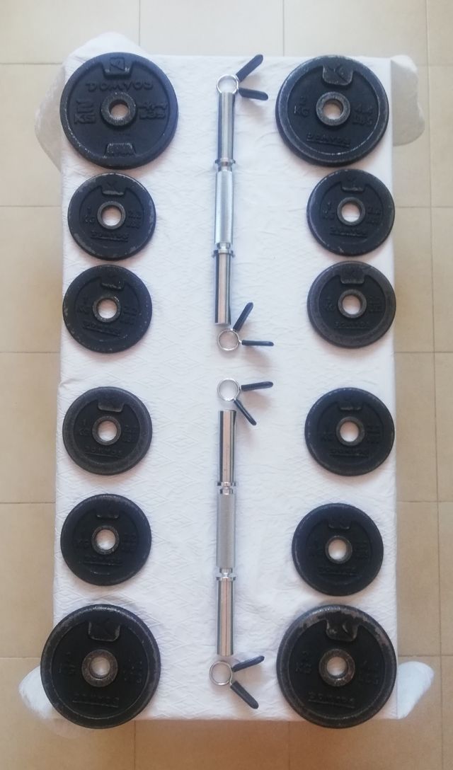 2 mancuernas con sus 4 cierres 4 discos de 2 kg 8 discos de 1 kg Todo de 28 mm Hacen un total de 2 mancuernas de 10 kg cada una. Se vende el lote completo.