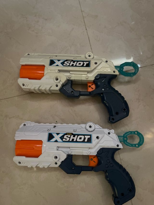 Se venden dos pistolas de juguete X-Shot de Zuru. - Color blanco y azul marino. - Detalle naranja en el gatillo. - Aro verde en la parte trasera.