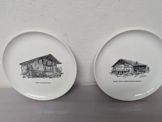 Detalles del productoConjunto de dos platos decorativos con ilustraciones de caseríos vascos.
