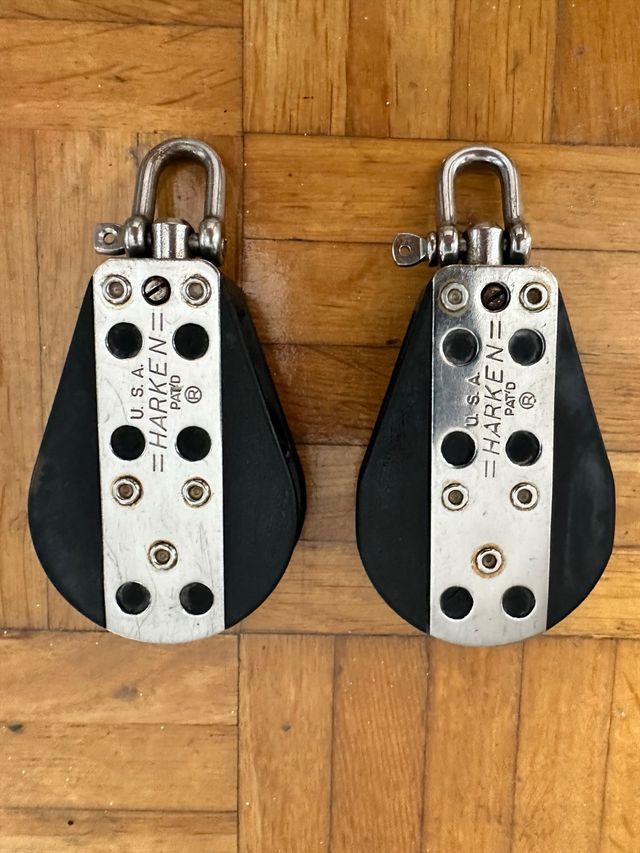 Detalles del producto2 poleas Harken Classic de 57 mm diámetro de roldana con giratorio y grillete fijacion. Para cabos de hasta 12 mm.  Rodamientos de bolas Delrin de alta calidad y piezas laterales de acero inoxidable. Longitud 108 mm, Peso 128 g. Carga máxima de trabajo 227 kg, Carga de rotura 1134 kg. Precio por las dos unidades.