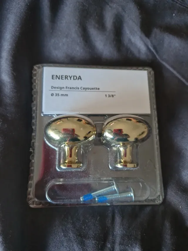 Pack de dos pomos dorados de la serie ENERYDA de IKEA, diseñados por Francis Cayouette. - Diámetro: 35 mm (1 3/8). - Incluye tornillos para su instalación.