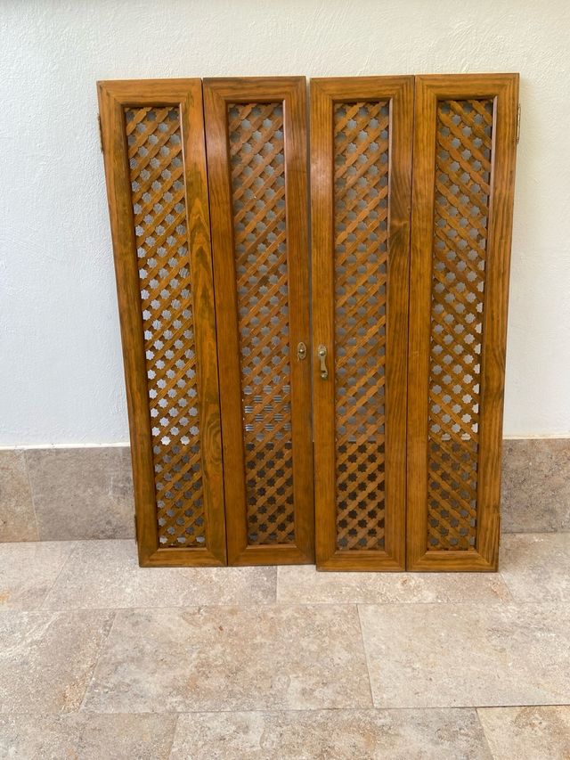 Detalles del productoPreciosa pareja de puertas de celosía de madera. Ideales para dar un toque rústico y elegante a cualquier espacio. - Fabricadas en madera maciza. - Diseño de celosía entrelazada. - Color marrón oscuro. - Incluye dos puertas con herrajes. - En buen estado.