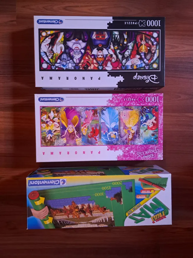Detalles del productoSe venden dos puzzles de Disney de 1000 piezas cada uno, junto con un tapete enrollable para puzzles. Ideal para los amantes de los desafíos.