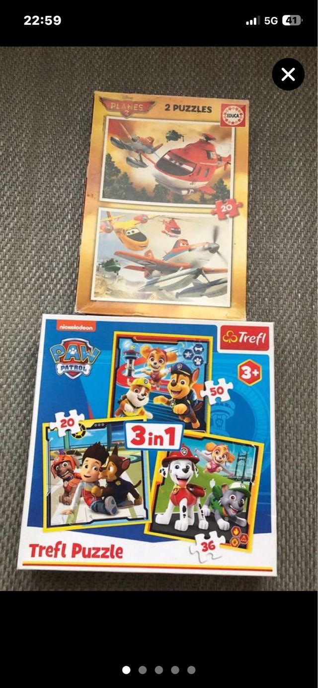 Pack de dos cajas de puzzles infantiles. - Una caja de la Patrulla Canina con 3 puzzles. - Una caja de la película Planes con 2 puzzles.