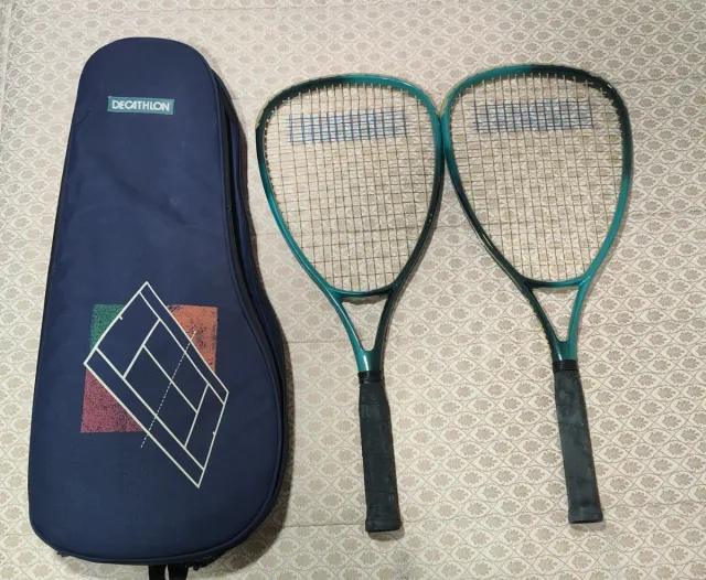 Detalles del productoPack de dos raquetas de tenis para adulto, ambas de color turquesa, junto con su funda azul de Decathlon.