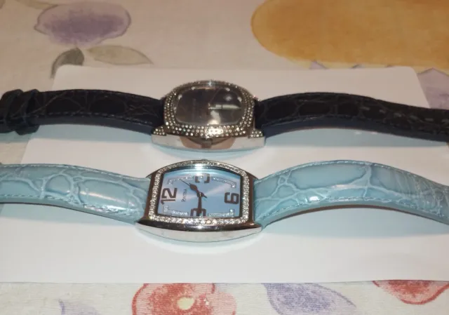 Se venden dos relojes de fantasía con correas de diferentes colores. - Un reloj con correa negra. - Un reloj con correa azul claro.