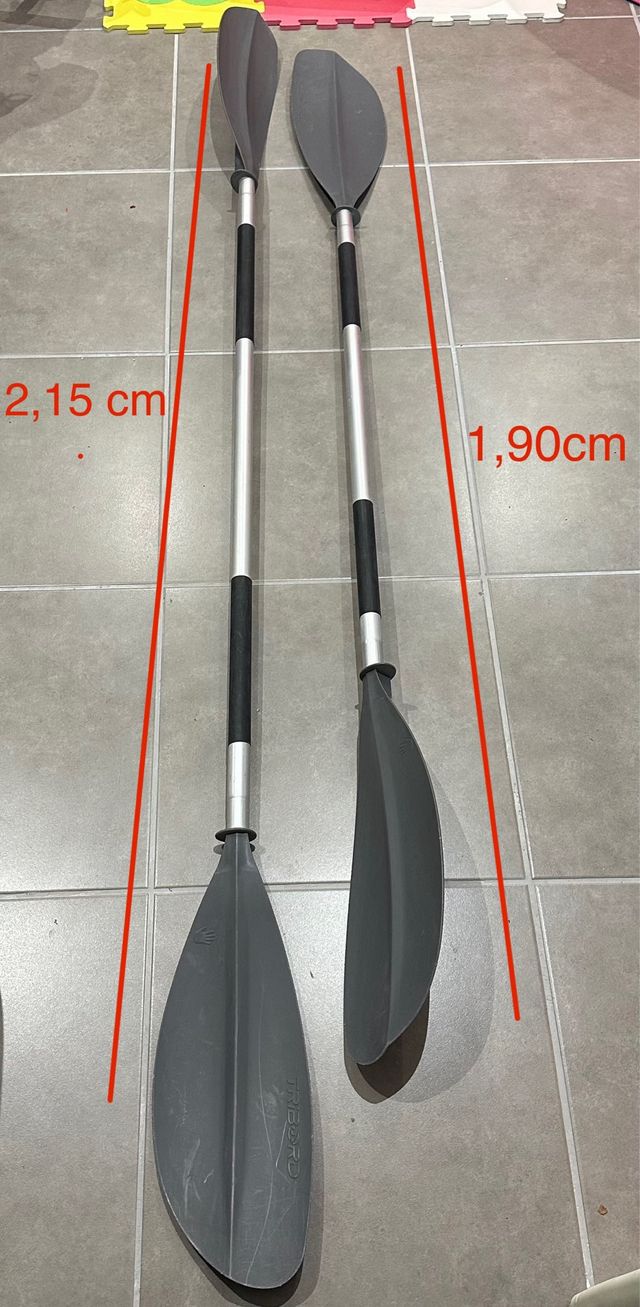 Detalles del productoSe venden dos remos de piragüismo de la marca Tribord. Uno mide 2,15 metros y el otro 1,90 metros.