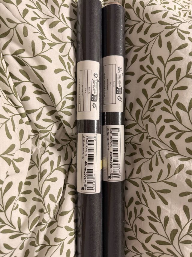 Detalles del productoDos rollos de vinilo autoadhesivo en color negro mate. Cada rollo mide 40cm de ancho por 200cm de largo.