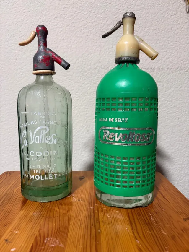 Lote de dos sifones antiguos de vidrio. - Sifón con etiqueta La Vallestana de J. Codina de Mollet. - Sifón con funda verde y etiqueta Revoltosa Agua de Seltz.