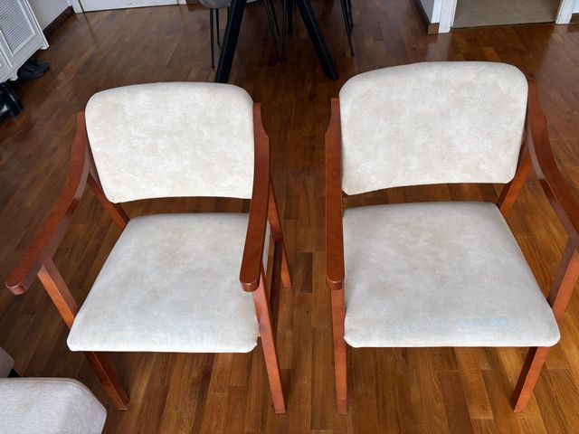 Madera en muy buen estado. El tapizado presenta alguna pequeña mancha de uso (visible en fotos). Se venden juntas con descuento.