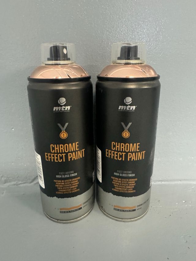 Detalles del productoDos botes de pintura en spray Montana Colors PRO Chrome Effect. Acabado cromado de alto brillo y secado rápido. Ideales para metal, plástico, madera, etc. Los botes son nuevos sin usar.