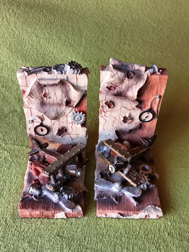 Dos sujetalibros con diseño de aviación y aventuras con elementos de época: avión avioneta , mecánica , engranajes, mapa , brújula , libro , guante .