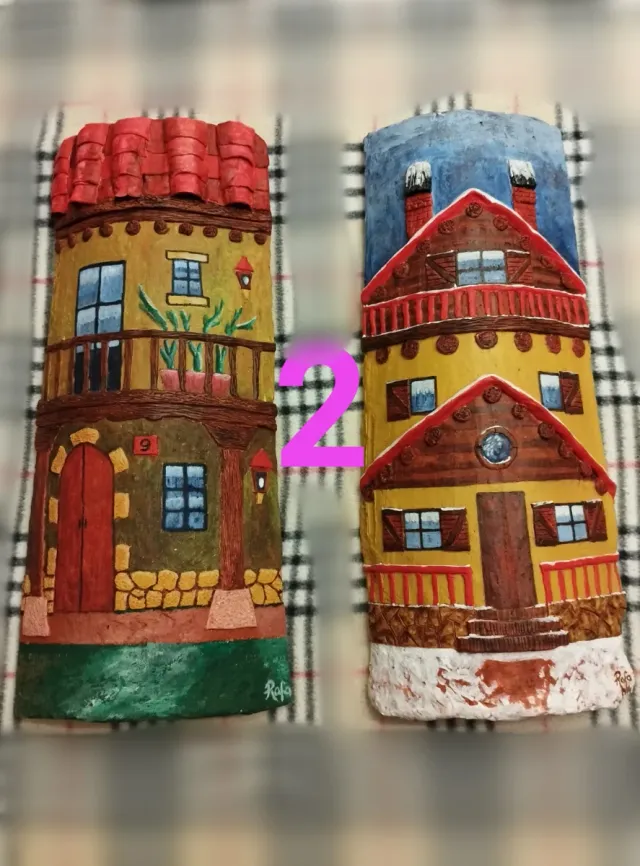 Detalles del productoConjunto de DOS tejas decoradas a mano con motivos de casas.