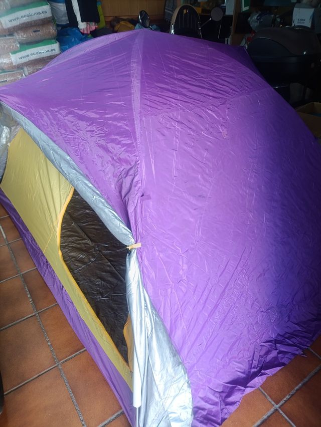 - Tienda de campaña de color púrpura con detalles plateados y amarillos.