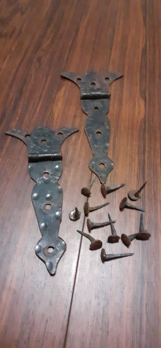 Detalles del productoPareja de bisagras castellanas antiguas de hierro forjado. Herrajes de fragua, son ideales para restaurar muebles antiguos o dar un toque vintage a los modernos. Con sus clavos originales.