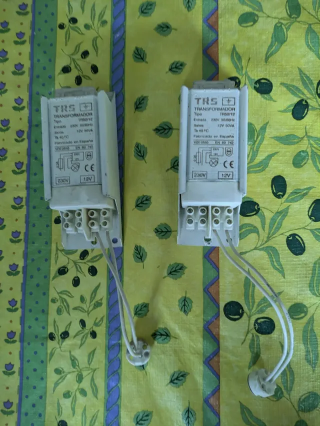 Detalles del productoVendo pareja de transformadores para lámparas halógenas en perfecto estado de funcionamiento. Fabricados en España por la marca TRS, muy fiables y robustos. Ideales para sustitución en focos empotrados de techo o proyectos de iluminación.