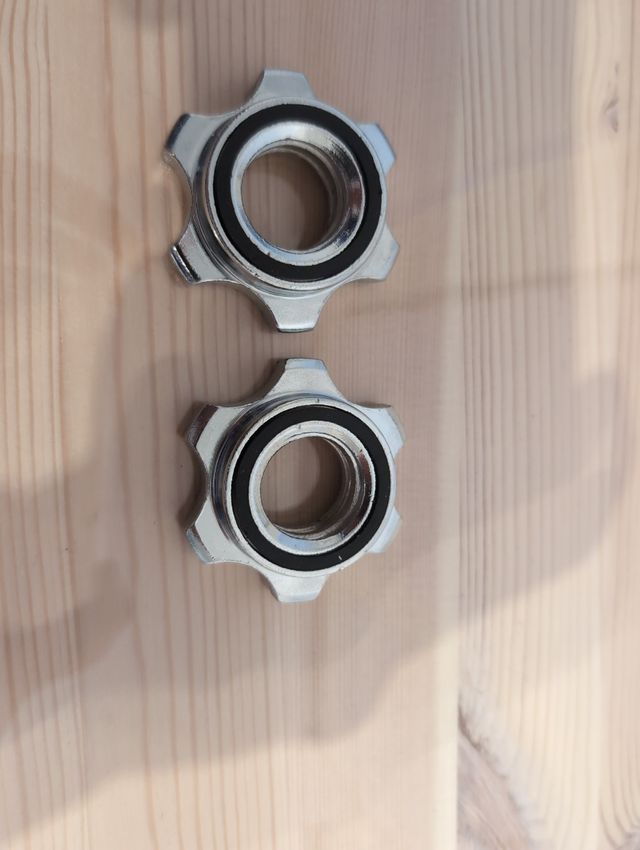 Detalles del productoPar de tuercas para barra de mancuernas. Son de metal, con acabado cromado en perfecto estado, sin estrenar.