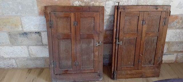 Detalles del productoPareja de ventanas de madera con porticones incorporados. Son dos piezas con un estilo clásico. Cada pieza mide 65cm de ancho x 93 de alto, fondo 5cm.