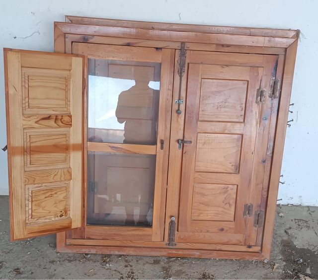 Conjunto de dos ventanas antiguas de madera con sus cristales. - Estructura de madera robusta. - Diseño clásico con paneles. - Incluye los cristales.