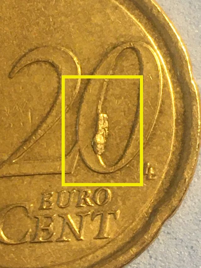 MONEDA CON EXCESO DE METAL EN LAS GAFAS Y EL EL 20 DE LA PARTE DEL REVERSO