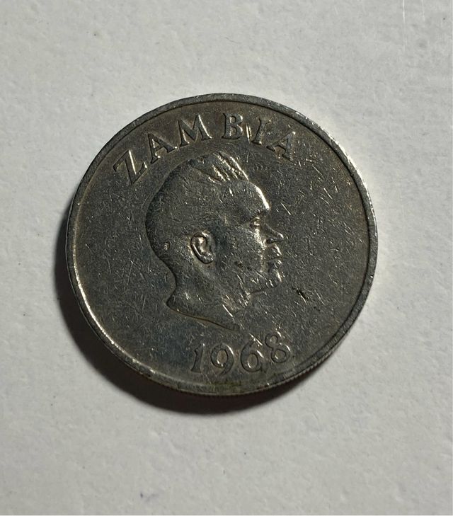 Moneda de Zambia de 20 Ngwee acuñada en el año 1968. Presenta el retrato de un líder en su anverso. - Año: 1968 - País: Zambia - Denominación: 20 Ngwee