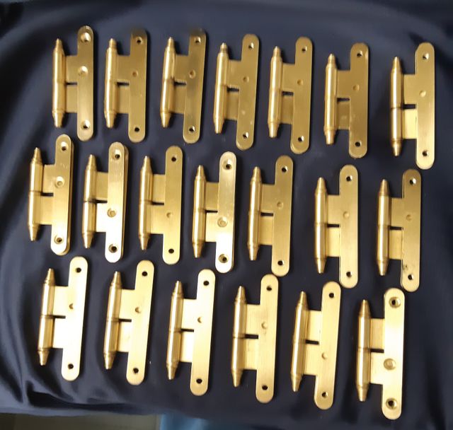 Detalles del producto20 PERNIOS BISAGRAS PUERTAS DE MADERA INTERIOR, MATERIAL BRONCE DORADO, MEDIDAS: 100 X 58 MM, CANTOS REDONDO, DERECHA (16), IZQUIERDA (4), PESO: 2 KG. APROX.