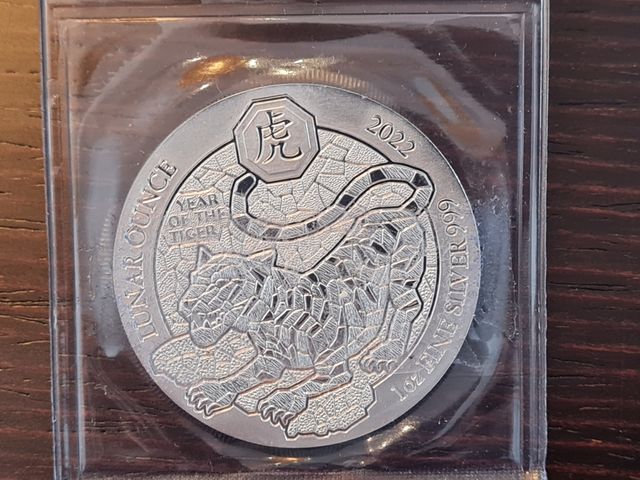Detalles del productoMoneda de una onza de plata pura 999 acuñada por Ruanda en 2022. Corresponde a la serie Lunar año del Tigre -Year of the Tiger - . En perfecto estado y en su blíster original.